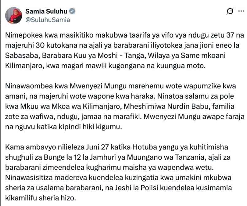 “Envio minhas sinceras condolências ao Comissário Regional do Kilimanjaro, Nurdin Babu, às famílias enlutadas, parentes e amigos”, disse Hassan em um comunicado. “Que Deus conceda paz às almas dos falecidos e uma rápida recuperação aos feridos. Que Ele conforte e fortaleça suas famílias neste momento difícil.” sourceFonte: G1