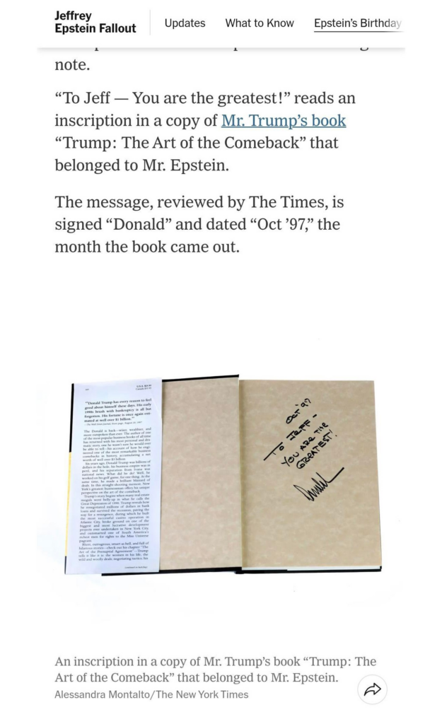 Foto que seria de dedicatória de Trump para Jeffrey Epstein New York Times / Reprodução O jornal americano “The New York Times” divulgou nesta sexta-feira (25) uma foto do que seria uma dedicatória em que o presidente dos Estados Unidos, Donald Trump, chama o bilionário Jeffrey Epstein de “o maiorial”. ✅ Clique aqui para seguir […]