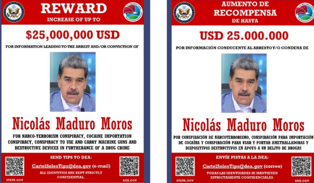 Departamento dos EUA divulga recompensa de US$ 25 milhões por informações que levem à prisão ou condenação de Maduro