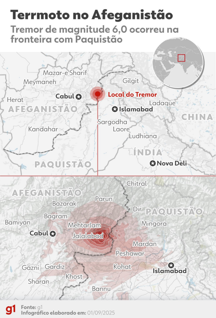 Terremoto no Afeganistão deixa mais de mil mortos O número de mortos causados por um terremoto de magnitude 6,0 que atingiu o leste do Afeganistão na madrugada desta segunda-feira (1º) subiu para 1.124. Outros 3.200 ficaram feridos, além de um rastro de destruição que já tornou o tremor um dos piores no país nos últimos […]