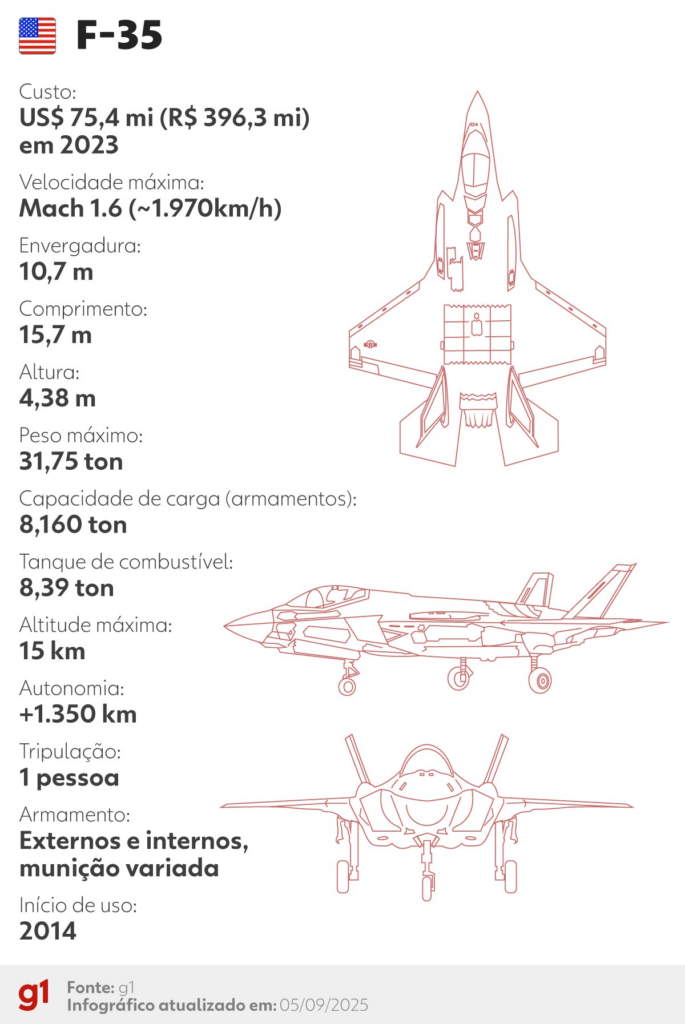 Os EUA operam o F-35A Lightning II. De acordo com a própria Força Aérea americana, trata-se de “um caça multifuncional ágil, versátil, de alto desempenho e com capacidade para 9g que combina furtividade, fusão de sensores e consciência situacional sem precedentes”. sourceFonte: G1