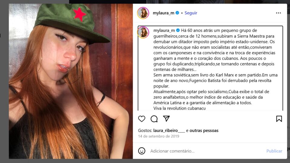 Criadora de conteúdo de esquerda e autodenominada marxista, Laura acumula 618 mil seguidores no Instagram para “tirar jovem do seio do liberalismo e colocar na teta de Marx (sic)”, como diz a descrição. Em seu canal, indica livros, opina sobre temas da conjuntura política, faz vídeos questionando discursos da direita e explica conceitos marxistas.